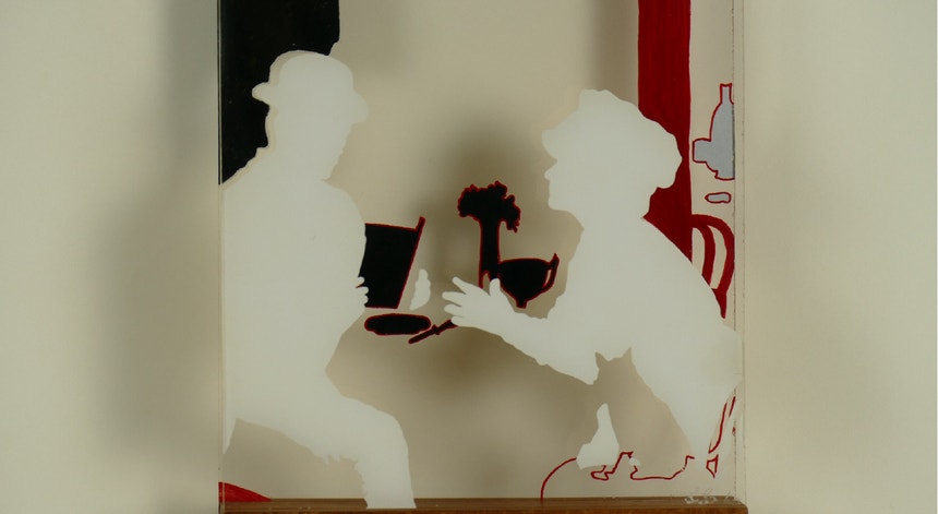 "In the café", titulo inglês desta obra, mostra-nos o uso de materiais inovadores, como as placas de plexiglas onde se destacam os contornos de duas personagens, uma masculina, absorta na leitura e outra feminina que a interpela.