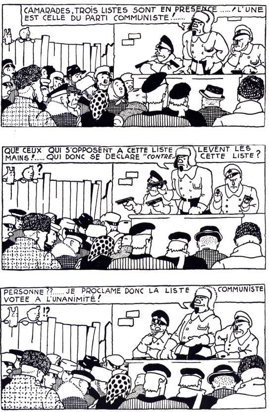 Do mesmo modo, celebrizou-se a cena de uma eleição, de braço no ar, com três listas concorrentes. O comissário que conduz a eleição pergunta se alguém se opõe à lista comunista e, perante o silêncio da assembleia, proclama-a vencedora da eleição, por unanimidade.