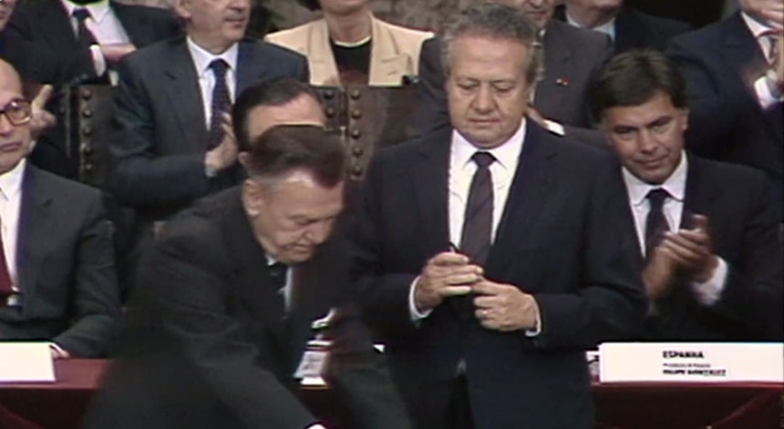 Quarenta anos depois, Cavaco Silva e Felipe González evocam o tratado de adesão de Portugal e Espanha à União Europeia. Os dois políticos chefiavam na altura os governos dos dois países.