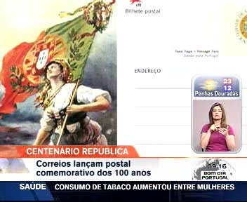 Os Correios lançam hoje um Bilhete - Postal comemorativo dos 100 Anos da República. O bilhete tem um selo que reproduz a conhecida imagem de uma figura feminina, em pose revolucionária, segurando a bandeira republicana. A iniciativa assinala o ciclo de Conferências sobre o Centenário da Proclamação da República que a Sociedade de Geografia de Lisboa está a realizar.