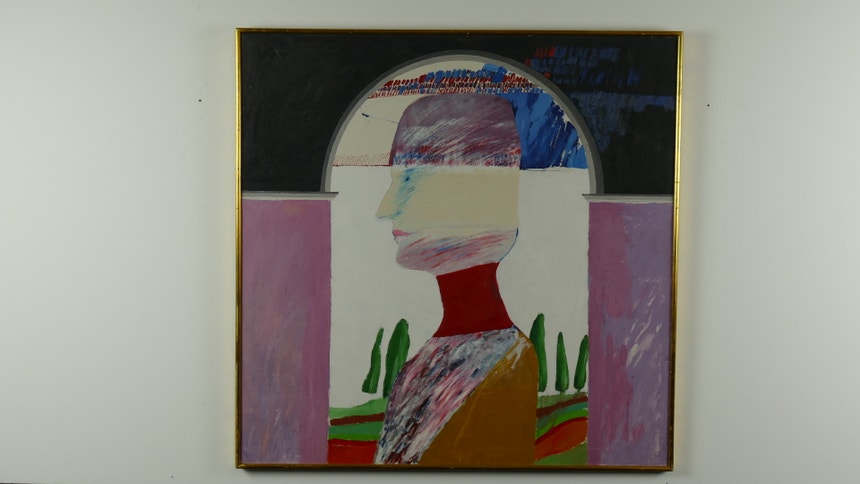 Uma cabeça hirta e de traços apenas esboçados sobrepõe-se a uma orla de ciprestes toscanos sob um arco clássico, remetendo com alguma ironia para os retratos do célebre pintor italiano pré- renascentista Piero de la Francesca.