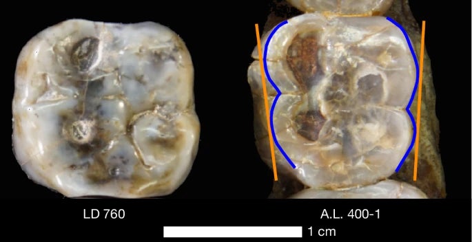 Contraste entre o perfil oclusal geral mais equilátero do LD 760 M 1 (novos fósseis - esquerda) e detalhe da fita distal (linhas laranja) e contorno de bilobato (linhas azuis) observadas no espécime A. afarensis M 1 A.L. 400-1 (direita) - B. Villmoare et al. / Nature (2025)