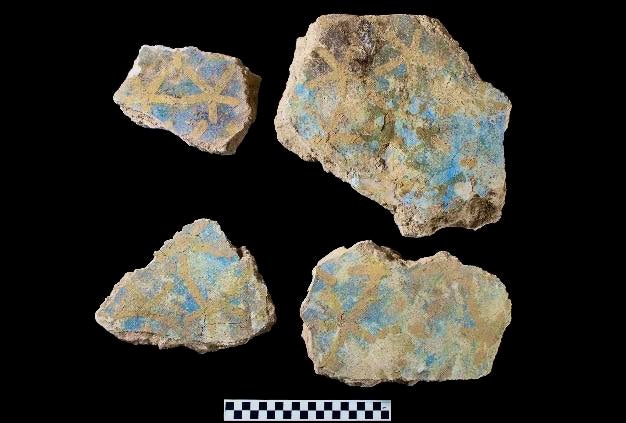 Fragmentos de estuque pintados de azul com estrelas amarelas encontrados dentro da câmara | Ministério de Antiguidades e Turismo do Egito