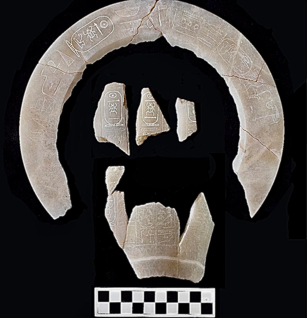 Fragmentos de frascos de alabastro com inscrições dos nomes de Tutmés II e Hatshepsut. Estes artefatos são os primeiros objetos a serem encontrados associados ao funeral de Tutmés II | Ministério de Antiguidades e Turismo do Egito