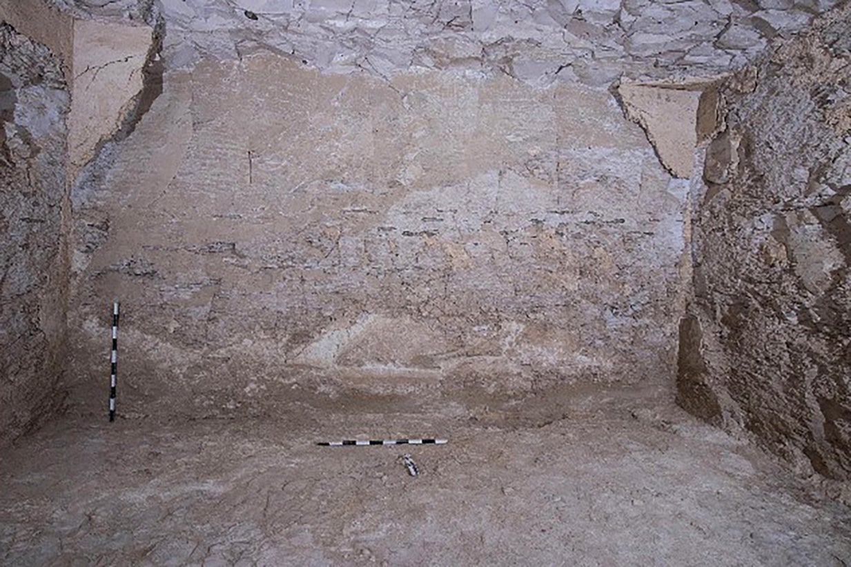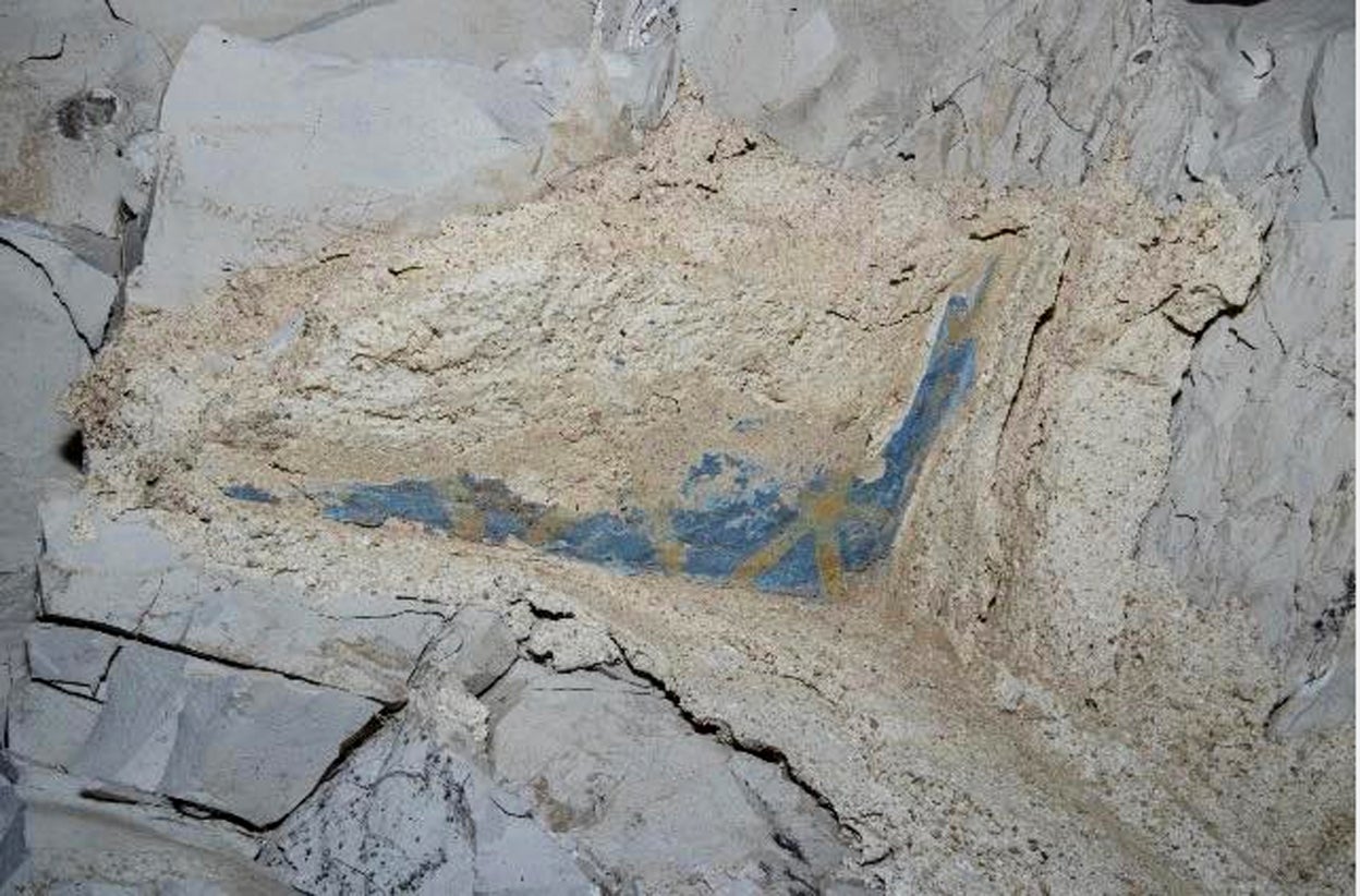 Recanto da câmara funerária com fragmentos de pinturas azuis e amarelas | Ministério de Antiguidades e Turismo do Egito
