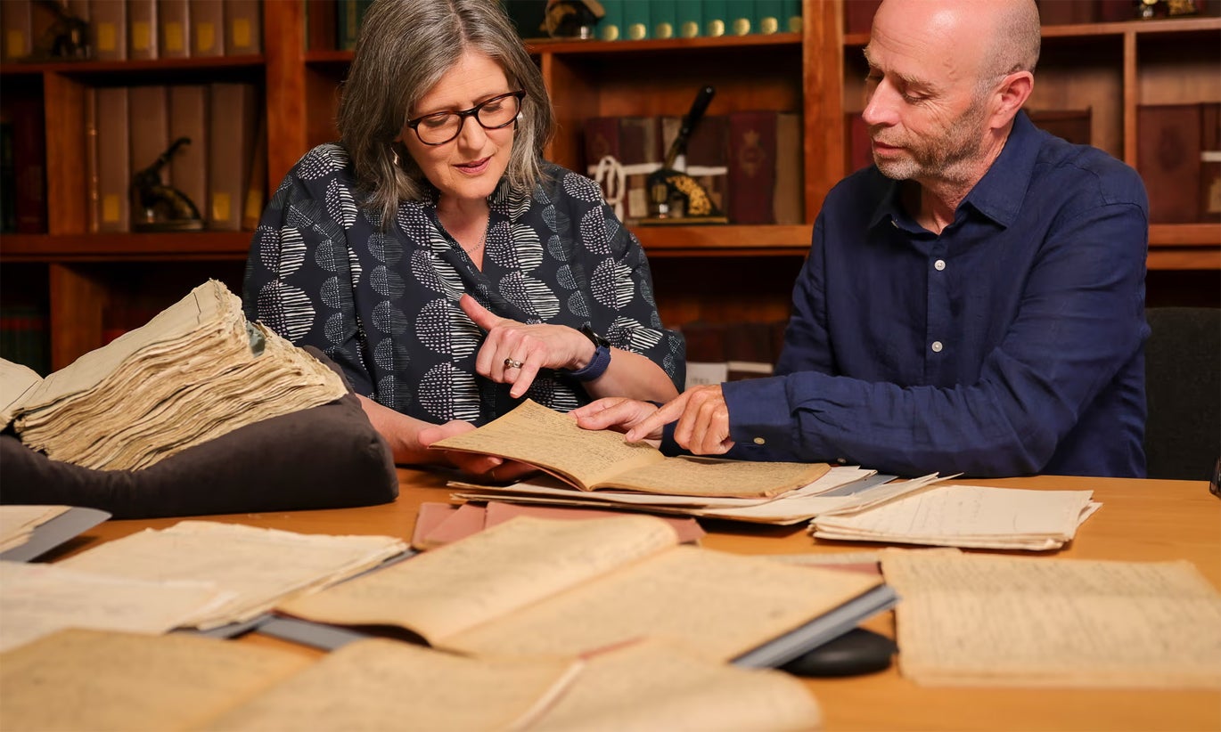 Zoë Reid, responsável pelos manuscritos do Arquivo Nacional da Irlanda, examina os registos com o especialista em censos Brian Gurrin.