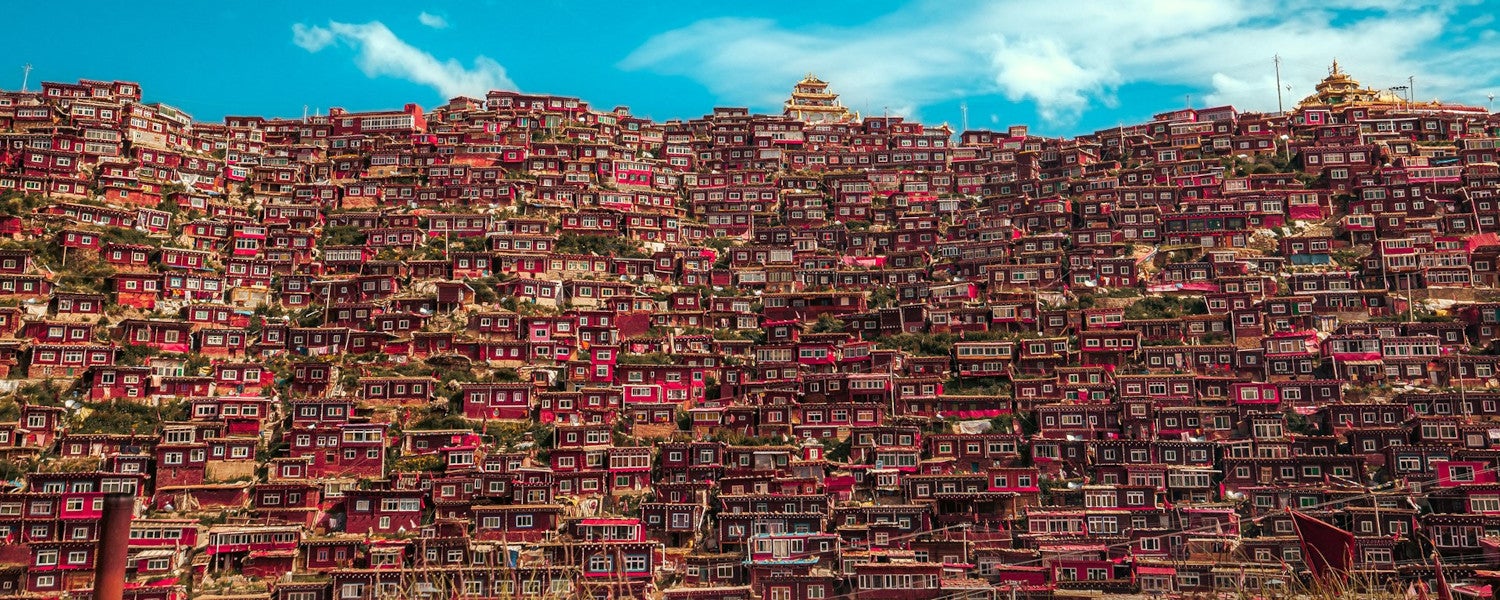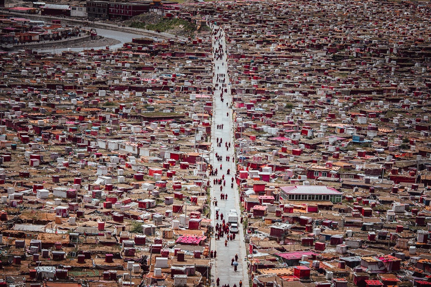 Uma das imagens que chama a atenção retrata as habitações de três metros quadrados dos monges em aprendizagem da religião budista, construídas de madeira e usadas apenas para dormir.