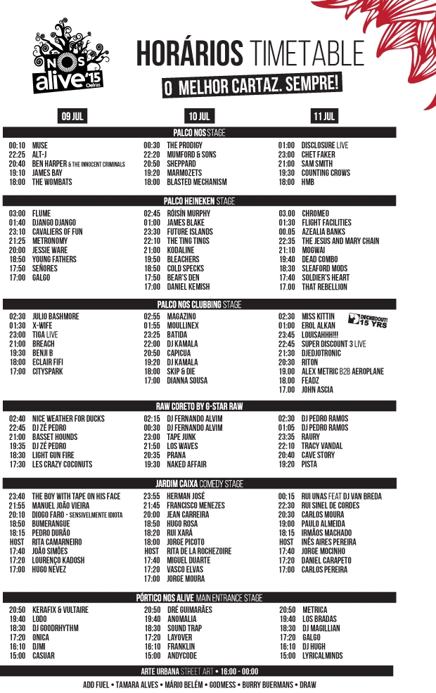 As atenções dos festivaleiros devem dividir-se, sobretudo, entre o palco de maiores dimensões, onde são esperados diversos músicos como Ben Harper, Alt-J, Mumford and Sons, Sam Smith ou Chet Faker, e a tenda no lado oposto do recinto, com Future Islands, James Blake, Metronomy e The Jesus & Mary Chain, entre outros.