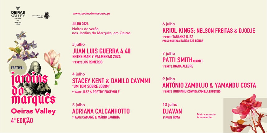 O festival Jardins do Marquês tem início esta quarta-feira, em Oeiras, com o cantor dominicano Juan Luis Guerra, numa edição em que o cartaz inclui a norte-americana Patti Smith e o brasileiro Djavan, entre outros.