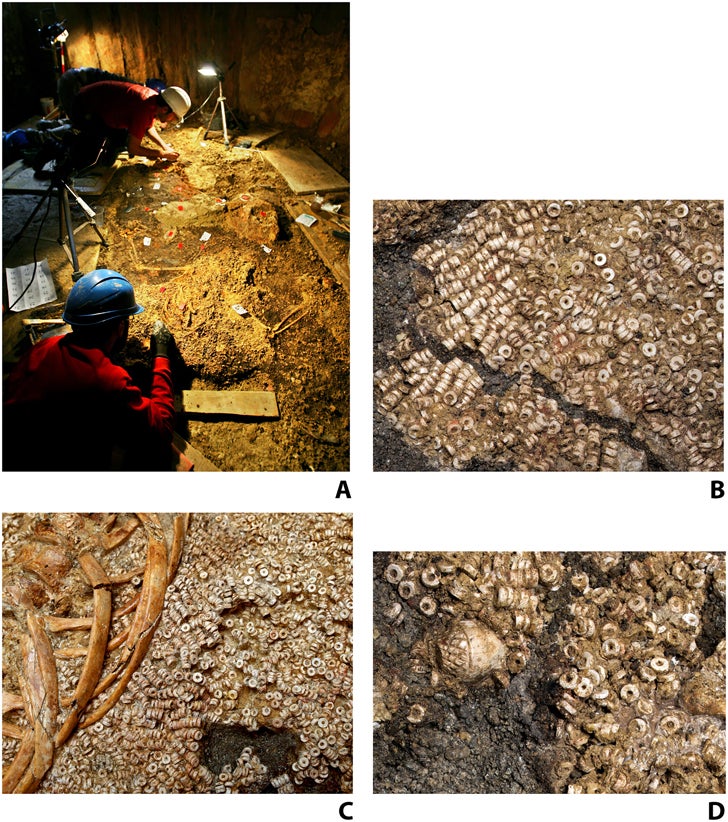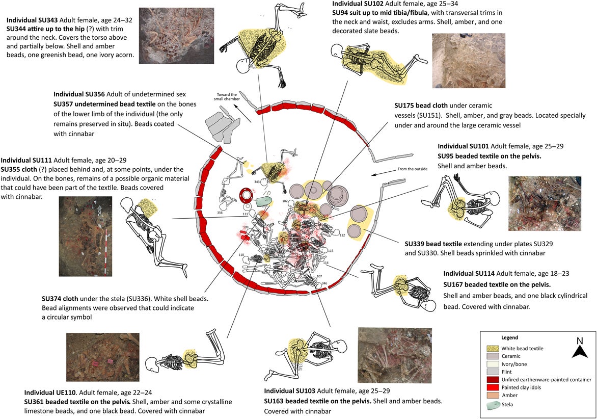 O conjunto de contas foram encontrados na câmara funerária a envolver os restos humanos. Pela disposição dos materiais, os trajes foram interpretados como “túnicas de corpo inteiro, saias e roupas de formato indeterminado. A escavação envolveu um processo meticuloso pelo qual os trajes foram individualizados e, em alguns casos, consolidados in situ”.