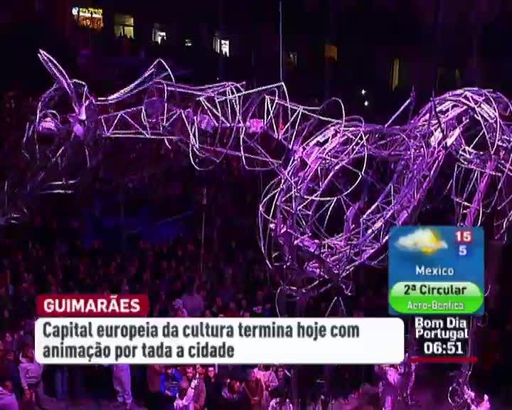 Assinala-se hoje o último dia de Guimaraes como capital europeia da cultura. O espetáculo de encerramento é uma homenagem musical às referências etnográficas da cidade e da região. Vai contar com a participação de uma orquestra e vários artistas. Guimarães 2012, termina com 48 horas de animação de rua.