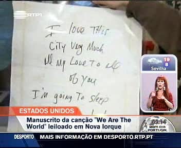 O manuscrito do tema "We Are The World", escrita por Michael Jackson, está em leilão, em Nova Iorque. Mas este não é o único item do rei da pop no leilão. Camisas, calças e outros acessórios usados na "Victory Tour", estão a mobilizar admiradores e profissionais do ramo. Em destaque estão também vários objectos relacionados com o lançamento do álbum BAD. Desde a morte de Jackson, em Junho passado, tem havido um aumento da procura de objectos que pertenceram ao cantor.