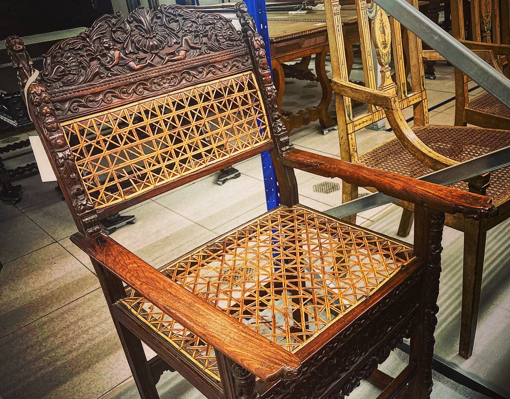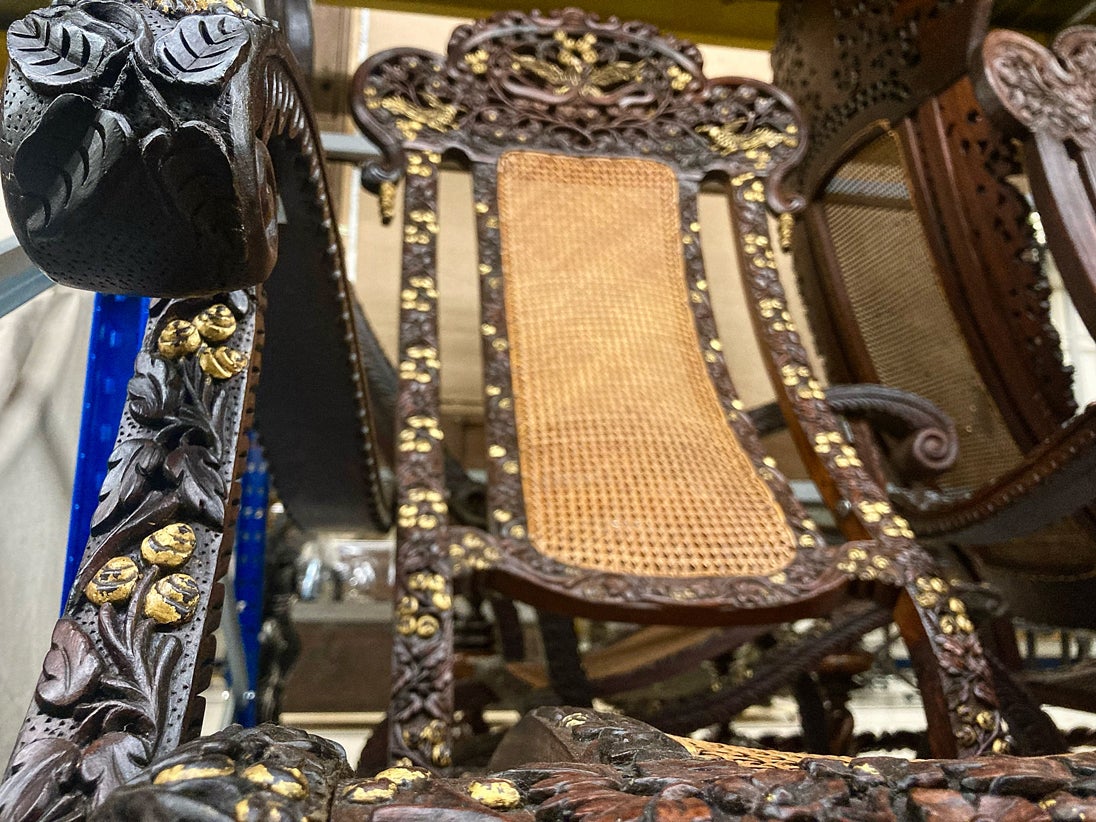 Os investigadores destacam também uma outra peça de mobiliário: a cadeira do séc. XVI de madeira de teca entalhada e palhinha encastrada.