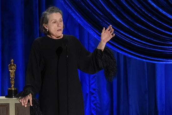 "Um dos momentos mais felizes para mim esta noite foi quando a Frances [McDormand] ganhou", contou Chloé Zhao aos jornalistas. "As pessoas podem não saber tudo o que ela fez, como produtora e como atriz, quão aberta e vulnerável foi e quanto me ajudou a fazer este filme", afirmou. "E como ajudou os nómadas a sentirem-se confortáveis nas gravações. Ela é 'Nomadland'".