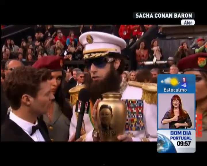 A ida do comediante britânico aos Óscares vestido de general Aladeen – o personagem principal do seu próximo filme "O Ditador" – causou polémica ainda antes da cerimónia, com a Academia a considerar impedir a entrada de Cohen na gala.