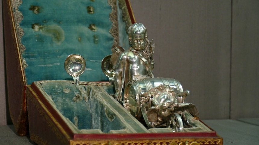 Segundo um modelo do escultor Falconet, o par de mostardeiras, de prata, foi executado pelo mestre ourives Antoine Sébastien Durant e destinou-se à amante do rei Luis XV, a célebre Madame de Pompadour.