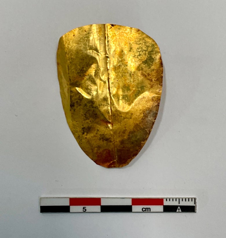 Uma das línguas em ouro fotografada com a escala de 25 centímetros | Ministério Egípcio de Turismo e Antiguidades