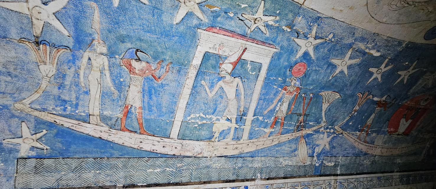 Descrevem ainda que o “teto exibe a deusa Nut, cercada por estrelas e barcos sagrados carregando divindades como Khepri e Ra, contra um fundo azul impressionante”.