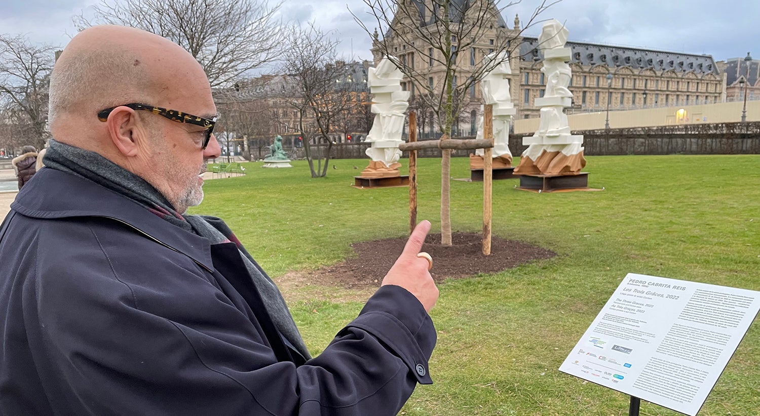 As Três Graças destacam-se na vegetação das Tulherias, nas muitas esculturas que espreitam entre as sebes aparadas a régua e esquadro e no tom mortiço dos edifícios que rodeiam o Louvre. As placas que assinalam a obra dão conta de um criador “artista maior da cena portuguesa”, “objecto de reconhecimento internacional” que se “confronta com a tradição e renova um tema antigo, muito presente nas colecções do museu do Louvre, nomeadamente na arte greco-romana”.