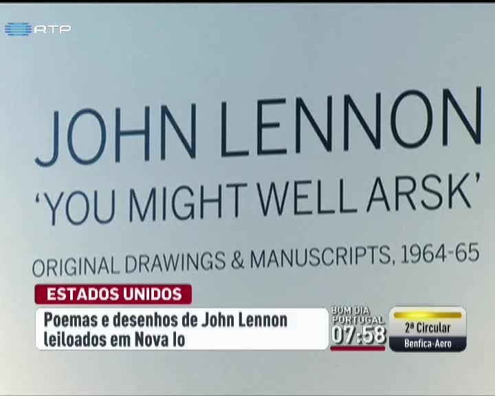 Nos Estados Unidos vão ser leiloados poemas e desenhos de John Lennon. Os trabalhos de John Lennon, antigo cantor e compositor dos Beatles pertenciam a um editor inglês. Ao todo são 89 peças. A leiloeira diz que é a maior coleção privada de Lenon a ser leiloada. Um dos desenhos em destaque é um rapaz com 6 pássaros que está avaliado entre 8 e 11 mil euros.