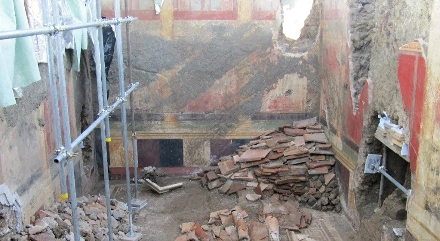 Alessandro Russo, um dos arqueólogo na escavação explica como recuperou um fresco do teto de um quarto: "Foi esmagado durante a erupção, e agora os fraguementos recuperados foram dispostas, como um puzle, numa mesa grande".