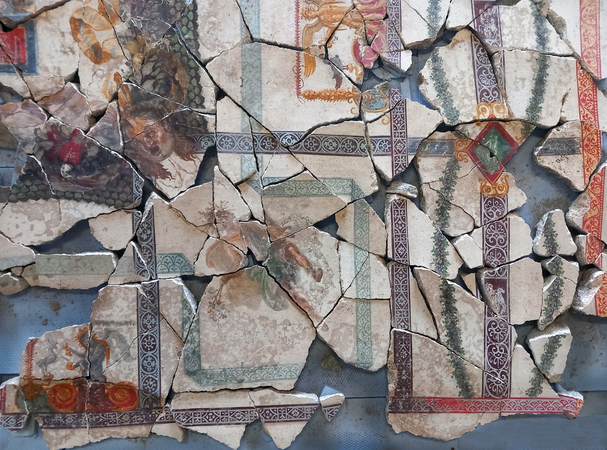 Depois de pulverizar os pedaços de gesso com água, os detalhes e as cores vivas sobressairam. Consegue-se ver paisagens com carateres egípcios, alimentos e flores e algumas máscaras teatrais.