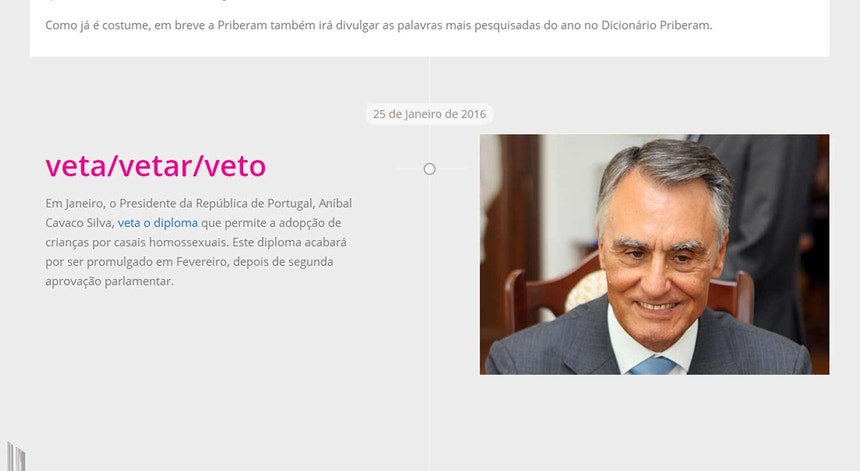 O dicionário online de língua portuguesa Priberam divulgou o conjunto de palavras mais pesquisadas pelos utilizadores em cada mês. A empresa registou uma correlação direta entre os acessos e os acontecimentos de política, desporto, sociedade e economia que marcaram 2016.
