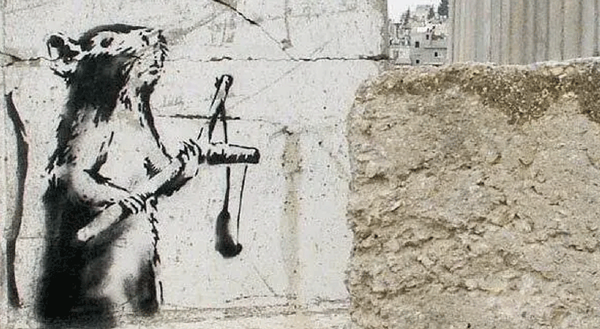Banksy pintou Slingshot Rat num bloco de cimento próximo de Belém, e o trabalho logo se tornou uma atracção turística e uma forma de solidariedade do artista com o povo dos territórios palestinianos ocupados. Depois, o bloco de cimento foi roubado e apareceu agora numa galeria de arte em Tel Aviv.