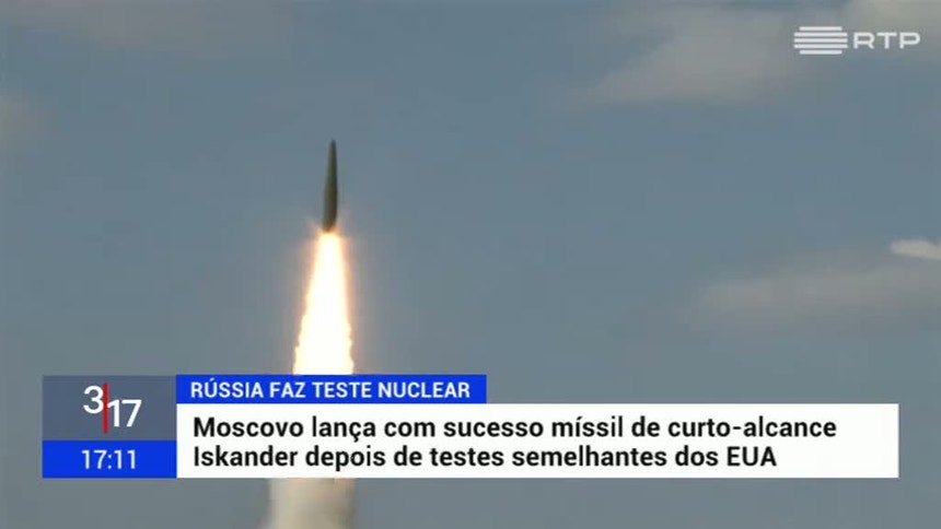 A Rússia testou um míssil de curto-alcance. Moscovo divulgou imagens do lançamento em que se vê parte do percurso do míssil e o momento em que atinge uma localização não-revelada.