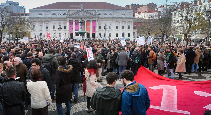 Em Lisboa, na Praça do Rossio, em frente ao icónico Teatro D. Maria II, os manifestantes expuseram uma tarja com o número 1. Pedem que o próximo Orçamento do Estado contemple um por cento das suas verbas para a cultura.