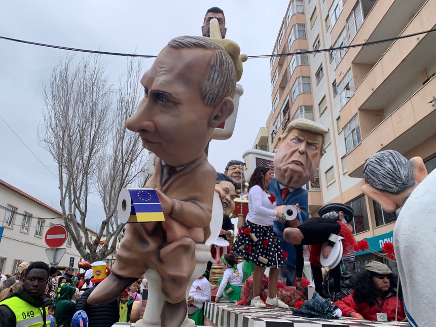 As ruas encheram-se de centenas de foliões para assistir ao desfile que tem como tradição as figuras das matrafonas e os cabeçudos. Não falta a sátira política neste ano em que o tema é o 25 de Abril.