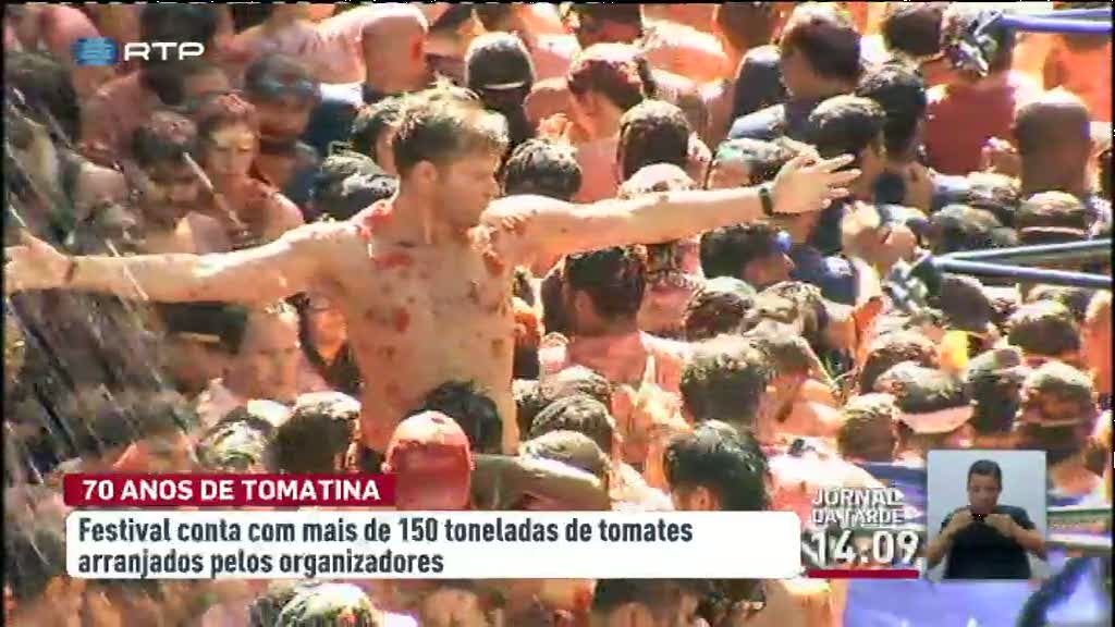 Andam tomates pelo ar e no chão da cidade de Buñol, em Espanha. As ruas estão transformadas numa espécie de lama vermelha.