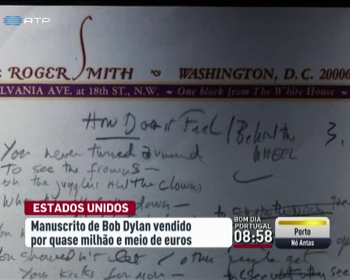 Foi vendido, em Nova Iorque, o manuscrito original de uma canção de Bob Dylan. Pertence a - "Like a Rolling Stone" a canção mais famosa de Dylan que marcou o rock nos anos 60. Foi leiloada pelo valor recorde de um milhão e 469 mil euros. A revista Rolling Stone elegeu esta canção como a numero 1 da historia do rock.