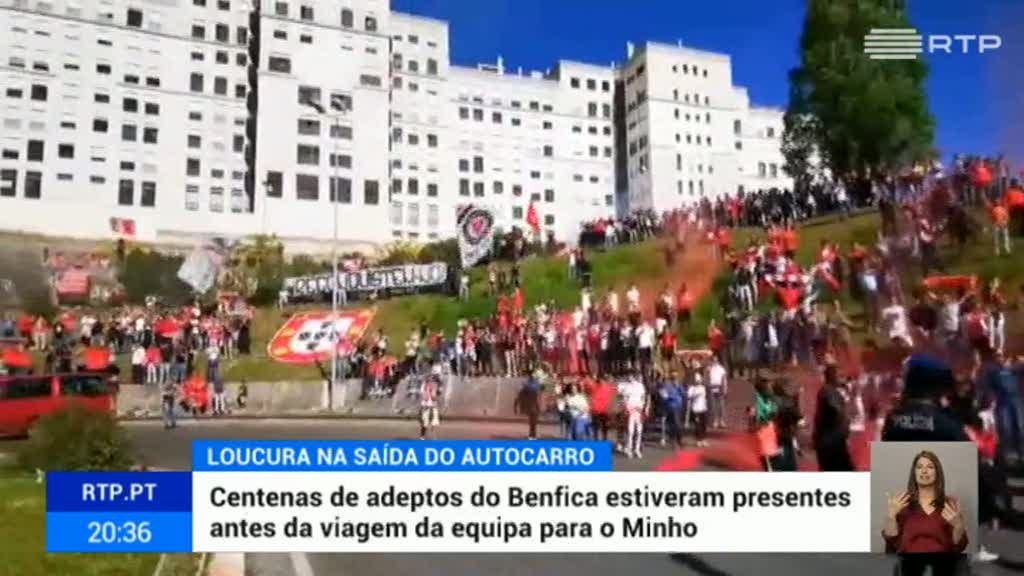 Desporto Adeptos do Benfica em força na partida da equipa para o Minho O ambiente entre os adeptos do Benfica é de euforia. RTP / VER MAIS Muitos juntaram-se no estádio da Luz para apoiar a equipa na saída em direção ao Minho. O autocarro do Benfica foi cercado por um "mar vermelho", com muitos cânticos e palavras de incentivo. PUB
