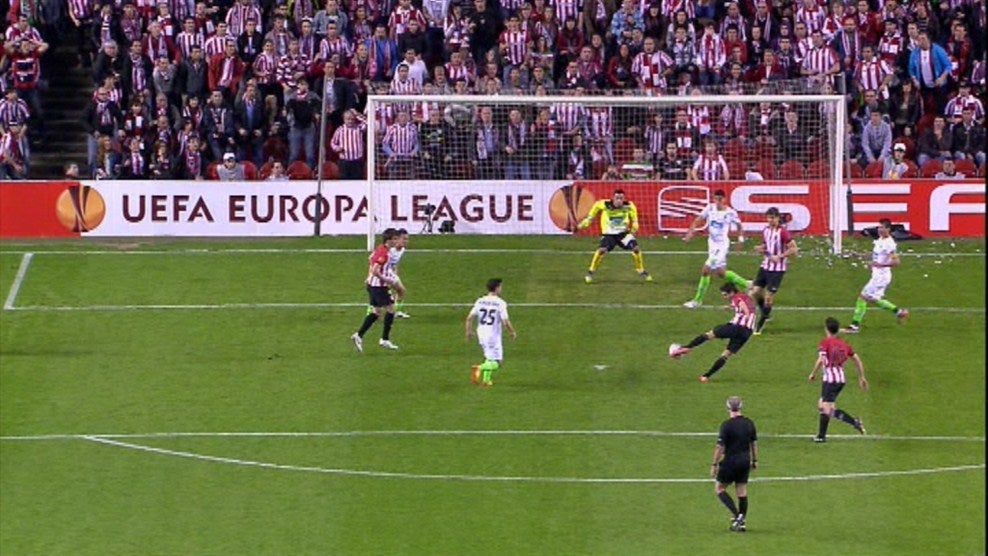 17' - Golo do Ath. Bilbao! Marca Susaeta! Herrera ganha a bola em falta a Schaars e combina com Muniain que serve Llorente que amortece de peito para a entrada de Susaeta, na passada, a fazer um pontapé de moinho.
