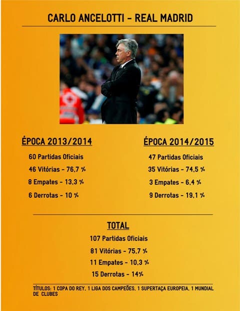 O técnico italiano leva até agora uma grande percentagem de vitórias pela equipa Merengue. Em 2014 venceu quatro títulos com o Real Madrid e quase conseguiu levar a equipa a bater um recorde de imbatibilidade. Foi por pouco, faltaram apenas três jogos, mesmo assim, numa grande fase da época 2014/2015, o Real venceu 22 partidas consecutivas. O Coritiba (Brasil) esteve apenas a três triunfos de ser ultrapassado.