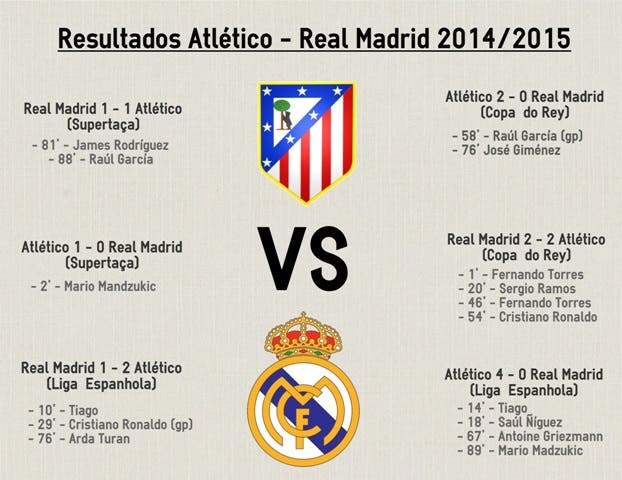 O Real Madrid tentou o empate nos restantes minutos do tempo regulamentar e aos 93 minutos logrou a sorte. Sergio Ramos bateu Courtois de cabeça e empatou a partida que foi para prolongamento. Nos 30 minutos que se seguiram, Gareth Bale, Marcelo e Cristiano Ronaldo marcaram os golos que deram a última vitória da equipa Blanca sobre o Atlético. Já lá vai quase um ano.