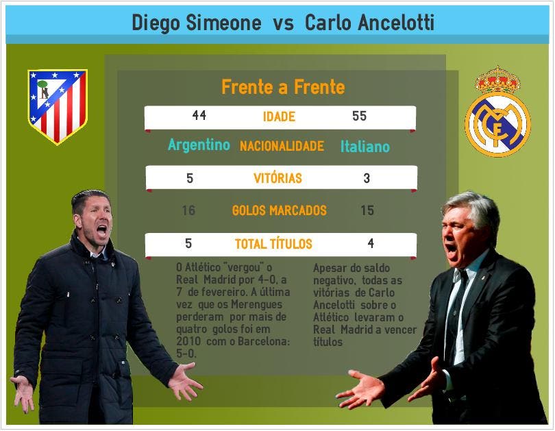 Já são onze os embates entre Carlo Ancelotti e Cholo Simeone. A contenda entre os dois começou melhor para o argentino. A 28 de setembro de 2013, o Real Madrid recebeu os Colchoneros no Santiago Bernabéu, em partida da sétima jornada da Liga Espanhola.