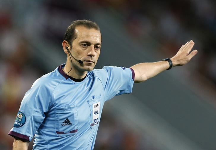 Cuneyt Çakir e o resto da equipa de arbitragem já pisam o relvado