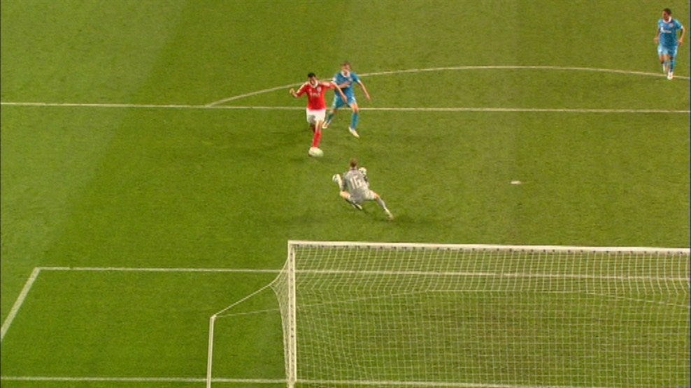 20' - Malafeev desvia um cruzamento/remate de Maxi Pereira! Entrada do lateral direito encarnado na área para, sobre a linha de fundo, cruzar ligeiramente atrasado mas Rodrigo e Cardozo estavam demasiado atrás para emendar. O guarda-redes do Zenit acaba por tocar para fora.