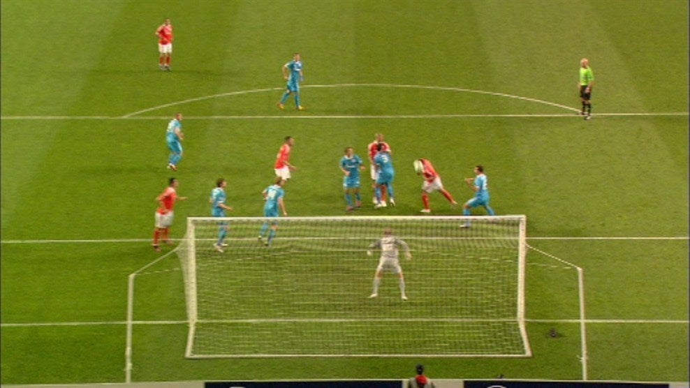 32' - Limpa o Zenit! Witsel foi à direita mostrar a Bruno César como se faz e numa troca de bola com Maxi Pereira cruza para a área onde Hubocan se antecipa a Cardozo e afasta.