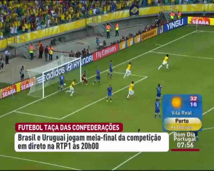 Hoje há mais um jogo da Taça das Confederações. O Brasil joga com o Uruguai. É o 1º jogo das meias-finais da competição. O Brasil chega a esta fase só com vitórias. O Uruguai sofreu uma derrota na fase de grupos. O Brasil-Uruguai começa às 8 da noite. Vai ser transmitido em direto pela RTP 1.