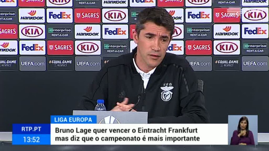 Desporto Bruno Lage dá prioridade ao campeonato O Benfica recebe o Eintracht de Frankfurt na primeira mão dos quartos de final da Liga Europa. Bruno Lage quer vencer mas dá prioridade ao campeonato. RTP / VER MAIS PUB