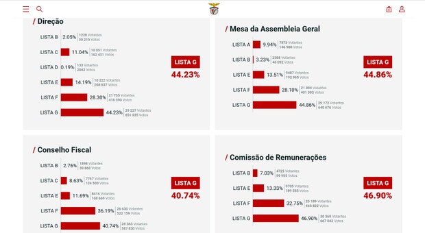 A lista encabeçada por Rui Costa também permanece no topo da corrida eleitoral aos restantes órgãos sociais, caso da Mesa da Assembleia Geral (45,14% dos votos e 198.369 votantes) e do Conselho Fiscal (40,99% e 181.480), com uma vantagem ainda maior no órgão estatutário da Comissão de Remunerações (47,47% e 207.791).