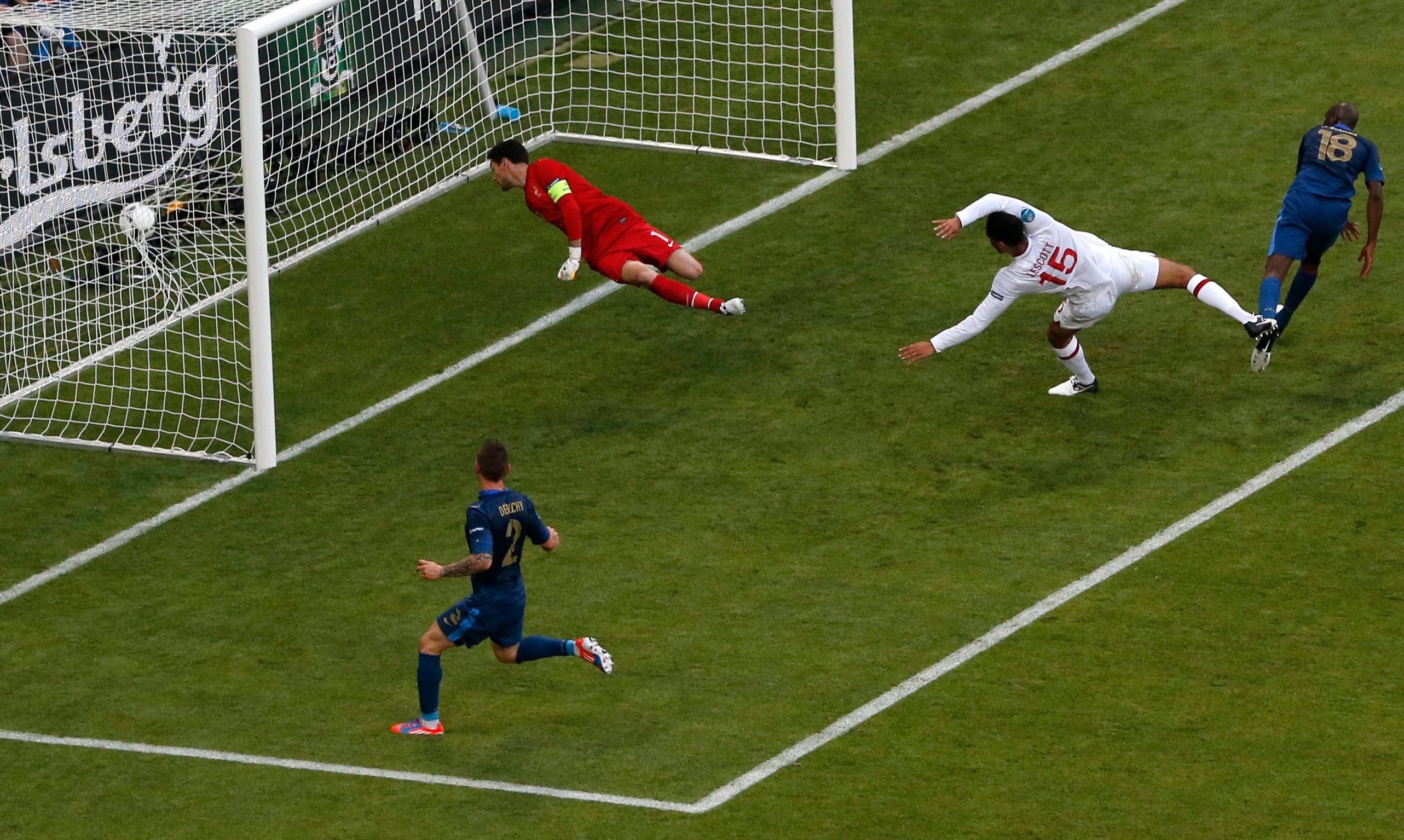 35' - Enorme oportunidade de golo para França. Diarra, fortíssimo, de cabeça, obriga Hart a uma grande defesa. A bola volta a sobrar para Ribery, que cruza atrasado para o meio da área, onde aparece de novo Diarra a cabecear a centímetros do poste direito da baliza de Inglaterra. Esteve à vista o empate.