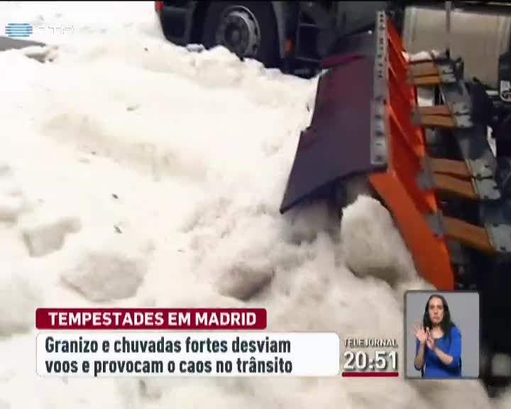 Madrid foi atingida por uma tempestade de granizo. A situação obrigou a desviar quatro voos no aeroporto da capital espanhola e provocou o caos no trânsito. A forte queda de granizo durou quase meia hora. Desde o final da noite de quarta-feira que a zona de Madrid tem estado sobre fortes tempestades. Equipas de bombeiros foram chamadas por cauda da quedas de árvores e desprendimento de telhados. A acumulação de água levou à interrupção temporária do serviço na linha 7 do metro e a linha ferroviária de Alicante ficou inundada, levando ao descarrilamento de uma composição.