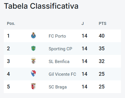 Com apenas mais uma ronda por disputar até ao Natal, o conjunto comandado por Francesco Farioli segue invicto no topo da I Liga, com 40 pontos, mais cinco do que o segundo colocado, o Sporting, enquanto o Estrela da Amadora é 14.º, com 14.