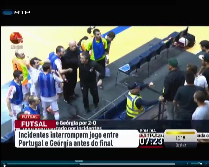 O jogo de Futsal entre as seleções de Portugal e da Geórgia não chegou ao fim devido a incidentes entre jogadores e o público. O encontro particular realizava-se em Vila do Conde quando o jogo foi interrompido a seis minutos do fim, depois de uma troca de palavras e de objetos entre jogadores da Geórgia e adeptos que estavam nas bancadas. No pavilhão, houve insultos e arremesso de garrafas de água e objetos diversos dos jogadores para os adeptos. Perante este cenário, os responsáveis das duas equipas decidiram terminar o jogo, quando Portugal vencia por 2-0. O selecionador nacional de futsal pediu desculpa aos adeptos pelos incidentes que ditaram o fim do jogo.