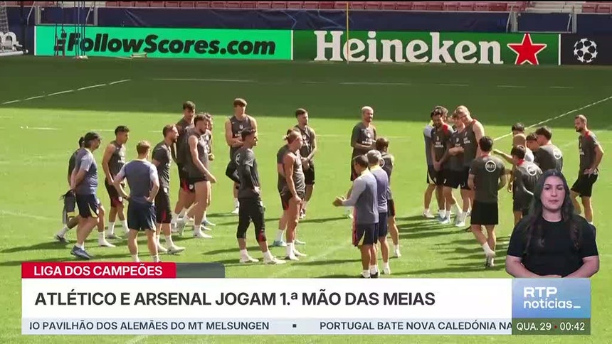 Desporto Liga dos Campeões. Gigantes europeus medem forças em Madrid nas meias finais O caminho para a final da %u2018Champions%u2019 passa hoje por Madrid. RTP / VER MAIS Atlético e Arsenal medem forças na primeira mão das meias-finais, num duelo que promete emoções fortes e que coloca em campo duas das equipas em melhor forma na Europa. PUB