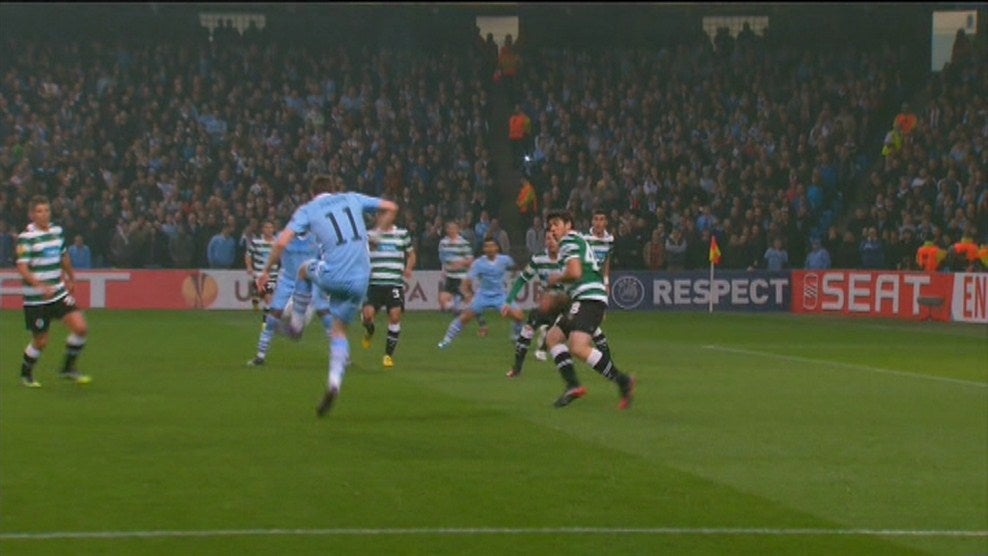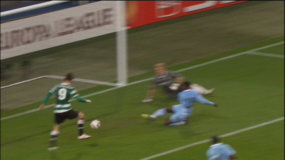 O Sporting tem que voltar a concentrar-se para não deixar que os avançados do Manchester City ganhem espaço para o remate.